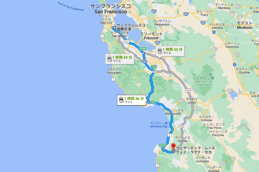 GOOGLEマップではこのルートが出るけど、時間に余裕があるなら海沿いのルート1で行くのもオススメ。途中でサンタクルーズでのトレイルライドもできます(別コンテンツにてご紹介)し、1日そこで時間が取れるともっと満喫できること間違いなし。