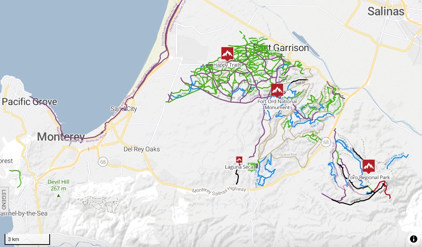 ラグナセカのあるエリアは丘陵地帯、ゆるやかな丘が連なっており、普段はトレイルライドができる。アスファルトに並走していて色々なルートが取れるし、バイクも選ばない。でもイベント期間中はほぼクローズなので、会場から車で15分くらいのところにあるToroRegionalParkへ移動。ここにナイスなトレイルがあるということで、夕方から行ってみる。