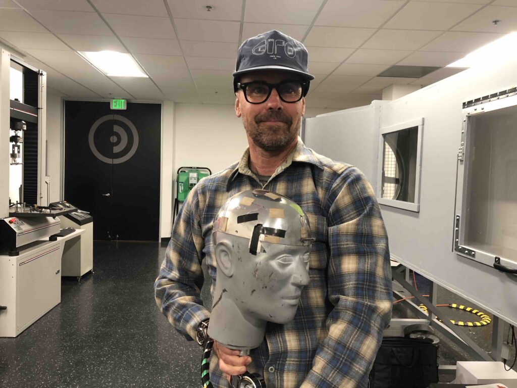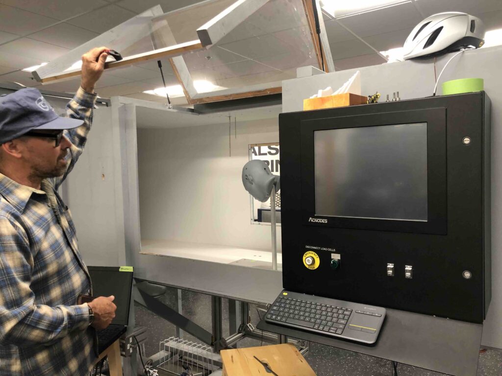 でも、後ろ側の大きめの穴からエアを引き出してヘルメット内部はクリーンな空気で保つようになっています。そんなことができるのも自社内にテストラボがあるからこそ。普通はアーバンヘルメットでこんなテストは行いません。