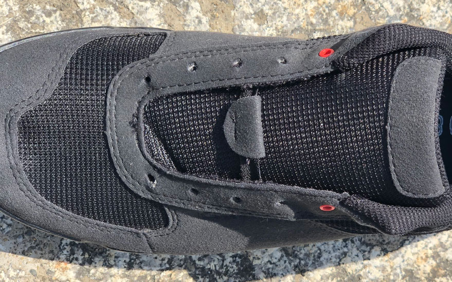 もう一つが足を曲げたときに足が痛くならないよう、タン周りに遊びができるようにアッパーの形状が工夫されている。サイクリングでは、かがむことも多いかと思うが足首が痛くなることもない。