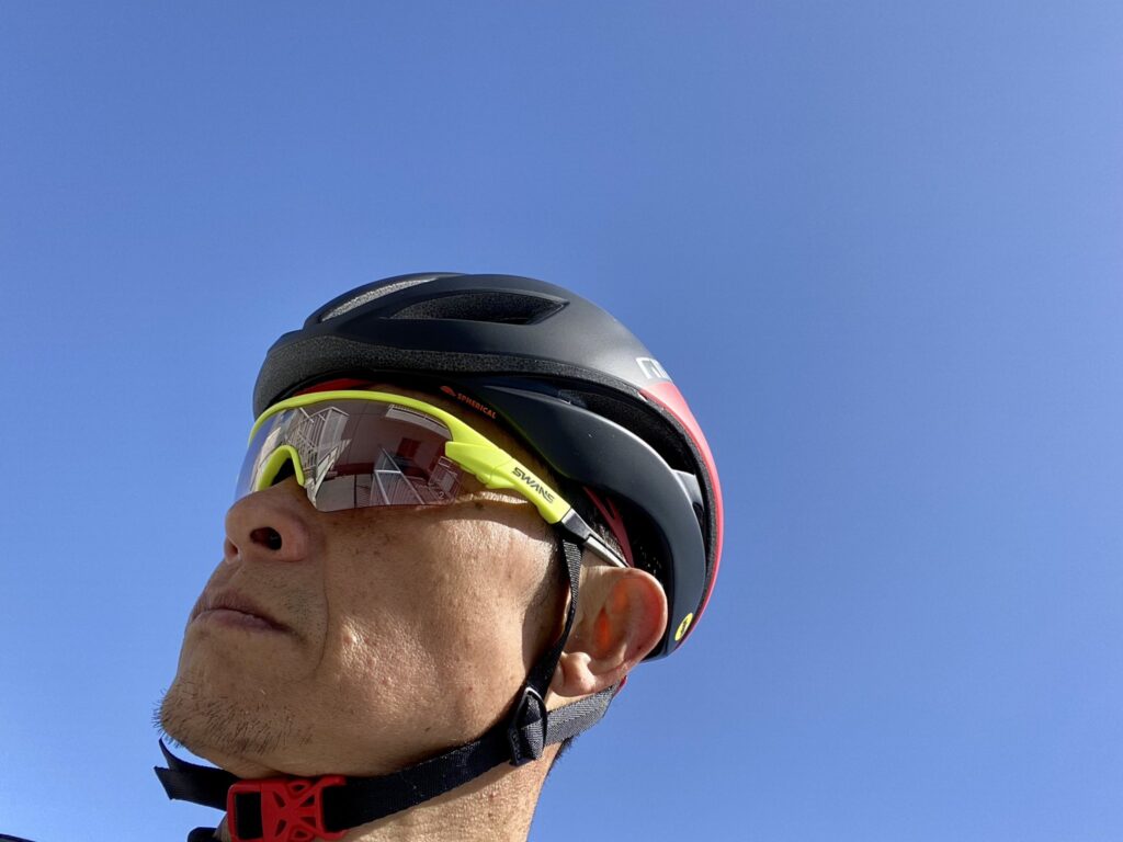 徐々に太陽がエネルギーを増し暑くなってくる中、90㎞付近で内側広筋がピクピクとし始める。この程度の強度で悲鳴を上げるなんて情けない奴と最初はののしっていたけど、その悲鳴が少しずつ大きくなり始める。別にこれ自体はアイアンマンにおいて珍しいことではないので、脚に負担をかけないように走るも、アップダウンの連続でそれも限界があり、100㎞過ぎで、いったん止まってストレッチ。ここで大きく痙攣させえてしまうと、長いこの先に大きく響く。その後も上りになるたびになだめすかしながら走る展開。それでも、下りでは攻めることが出来たのが救いで、長い下りで風を切り、それでいて通気性と軽さを併せ持つエクリプスをチョイスしたことは大きなアドバンテージ。暑く、厳しい上りと長くスピードの出る下り。まさにこんなコースのためにできたヘルメットでした!?