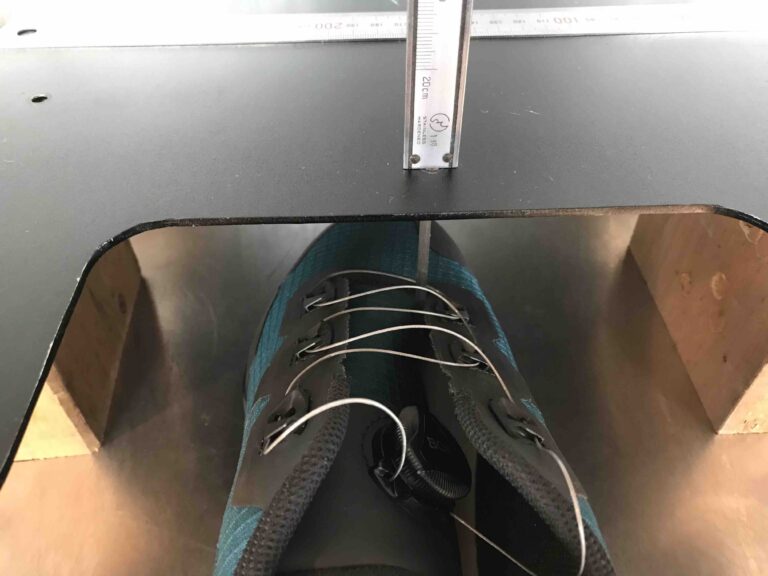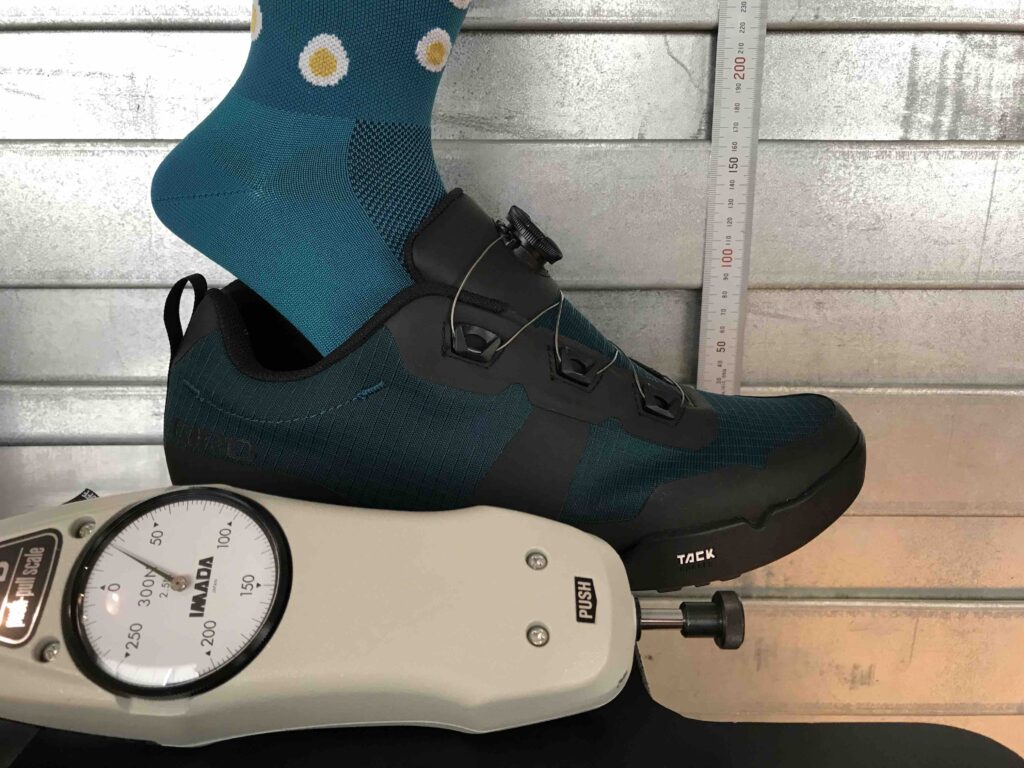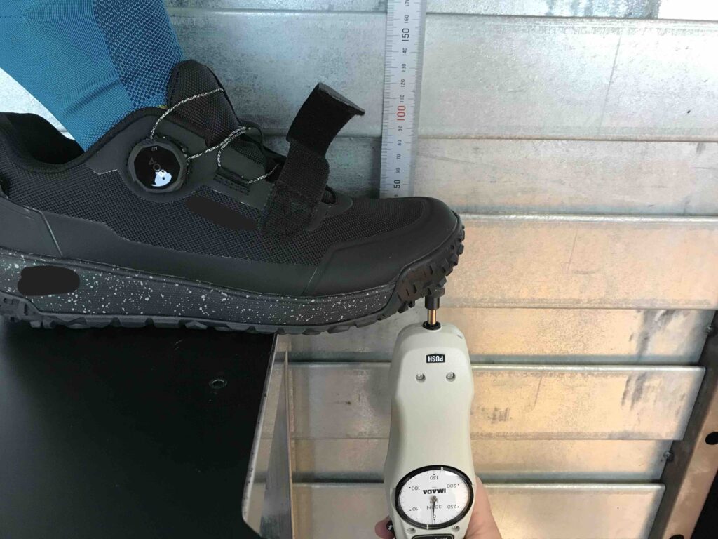 テスト方法は、拇指球の位置で押さえつけ、シューズの先端を3cm持ち上げるのにかかる力を測ってみます。