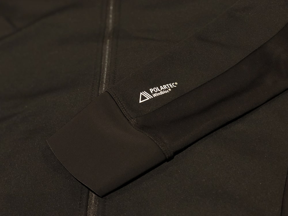 肩・腕・前面に採用された Polartec® Windbloc® の完全防風素材。