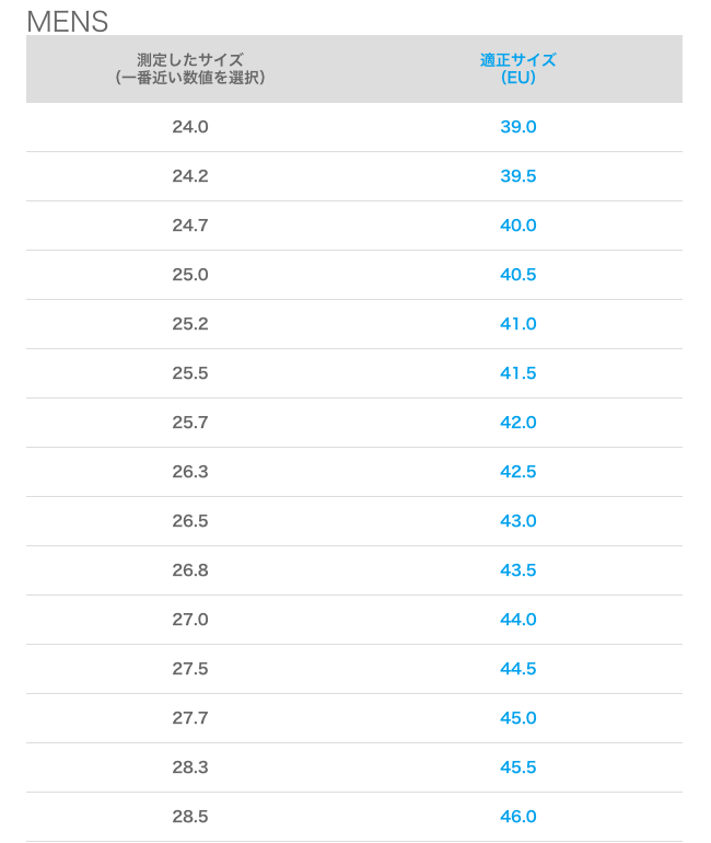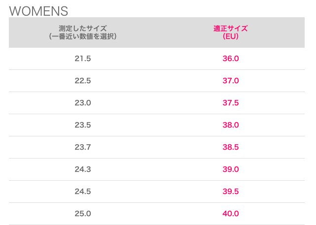 ここで計測した実測値により、下のサイズ表を目安にシューズサイズを選択しますが、