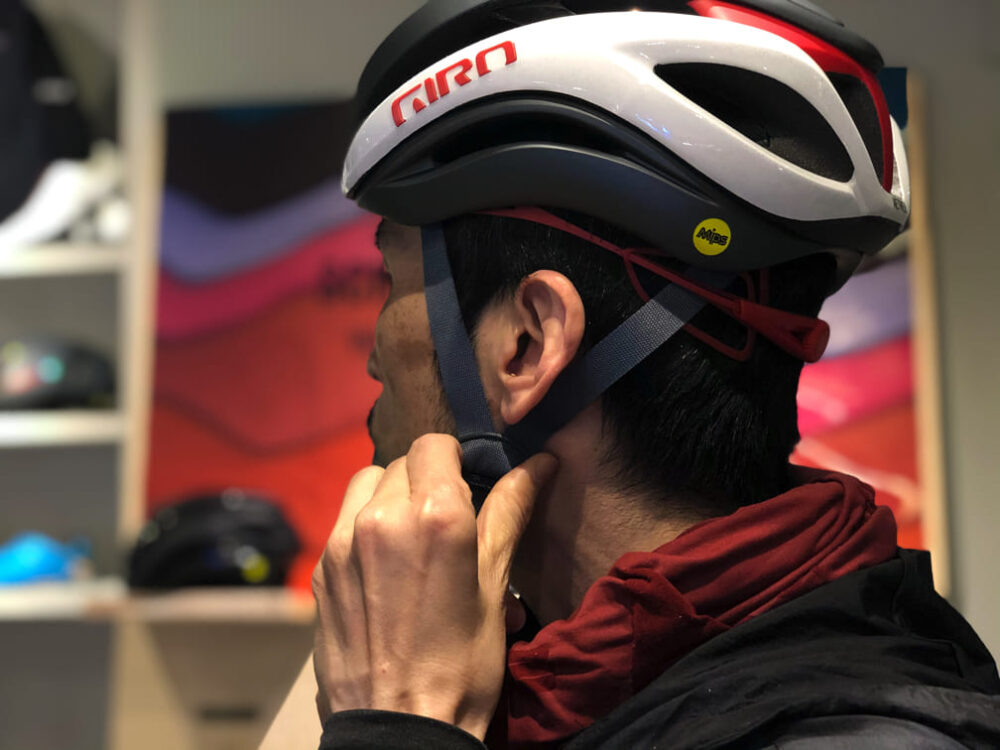 こうすることで、ヘルメットの前後左右へのズレや走行中の風によるストラップのバタつきも抑えられます。