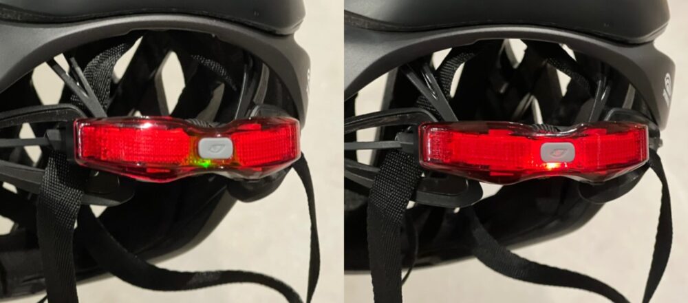 ライト中央のボタンで、点灯 / 点滅 / 消灯 の切り替え操作をした際に、グリーンまたはレッドの小さいライトがつき、バッテリー残量の目安が確認できます。