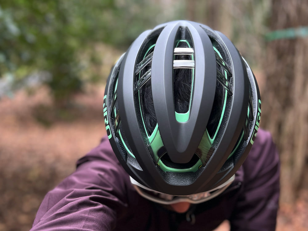 前部から頭頂部を通り、そして後部へと抜ける風の通り道が、これまでのヘルメットにはないほどに巧妙で、風の通り道が広く効率的に抜けやすく設計されているように感じられます。