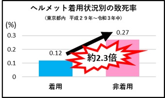 また、ヘルメットの着用状況による致死率では、着用していない場合の致死率は、着用している場合と比較すると約2.3倍も高くなっています。
