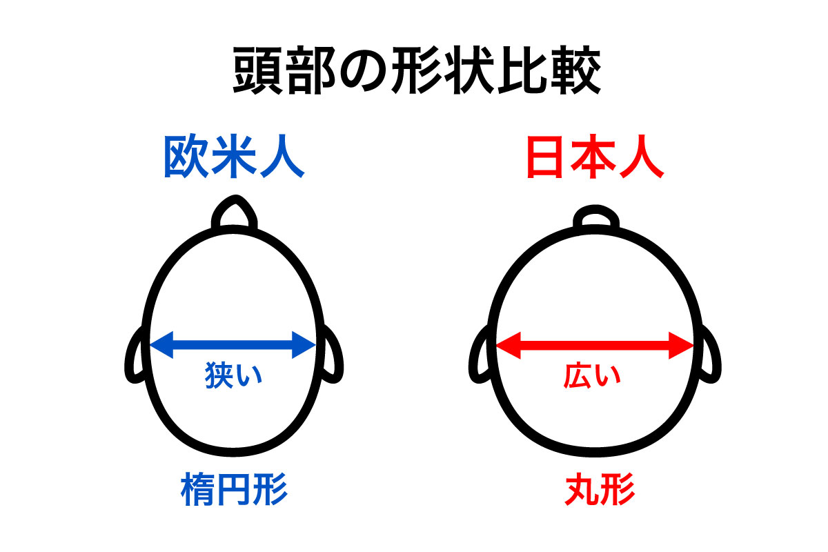 日本人はこめかみ辺りから側頭部まで幅が広く、さらに前後にも詰まっていることから丸形になる人が大半を占めます。