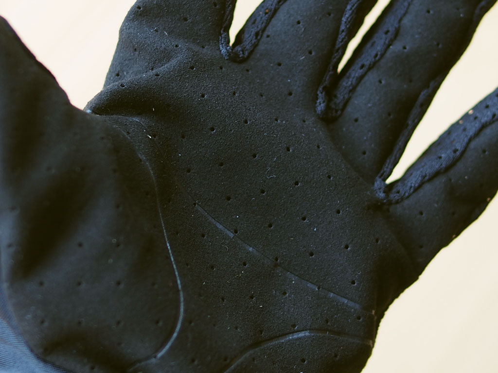手のひらのマイクロファイバーはシンプルに1枚で仕上げながら、立体構造で、さらにパンチングを施し、毎日のライディンググローブに必要な耐久性を犠牲にすることなく、出た汗の処理と冷却をさらに強化します。手相のような線は、ハンドルを握った際にグローブのシワができにくくするための工夫です。手のひらのグローブのシワって意外とストレスですよね。