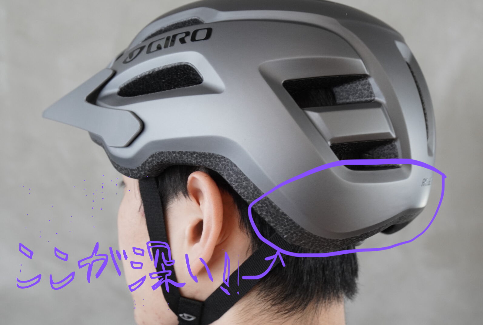 ロードバイクなど前傾姿勢で乗る場合は首の後ろに干渉するため後ろ側の首上を浅くする傾向がありますが、アップライトな乗車姿勢の場合はこのように深い被りにすることが可能です。