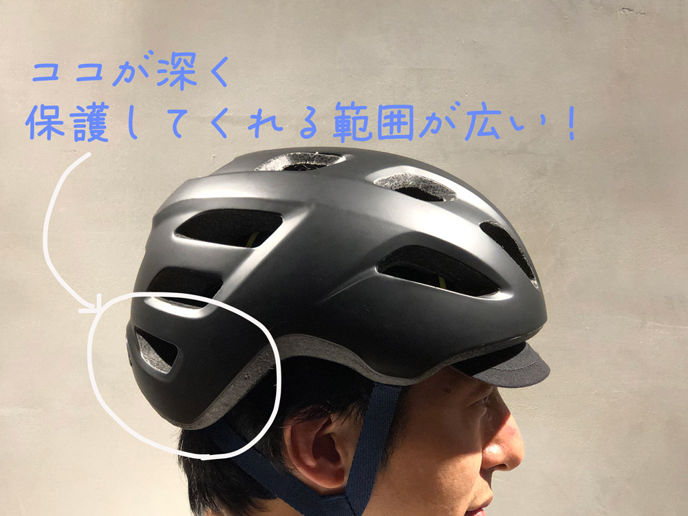 ヘルメットはできるだけ保護する範囲が広い方がいいです。ロードバイクなど前傾姿勢で乗る場合は首の後ろに干渉するため後ろ側の首上を浅くする傾向がありますが、アップライトな乗車姿勢の場合はこのように深い被りにすることが可能です。
