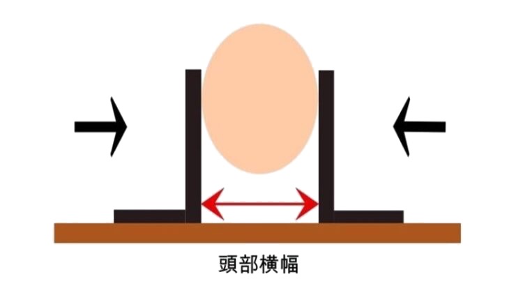 一例)下画像のように、平らなテーブルの上にL字のブックスタンドのようなもの(硬い素材のもの)を2つ置き、顔をテーブルの面へ向けた状態で左右から頭部の耳の上の部分(頭部の一番幅が広いところ)にL字スタンドを当てる。