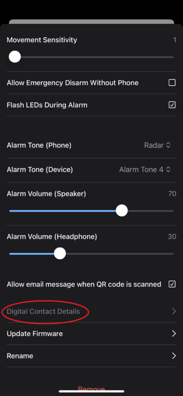 アプリのデバイス設定からDigital Contact Detailsを開き、任意の文章を記入することで、