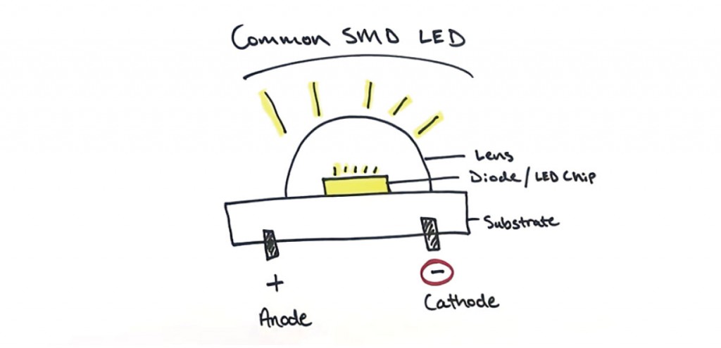 SMD LEDは、1つの基盤、1ペアの電極、1つのLEDで構成されています。