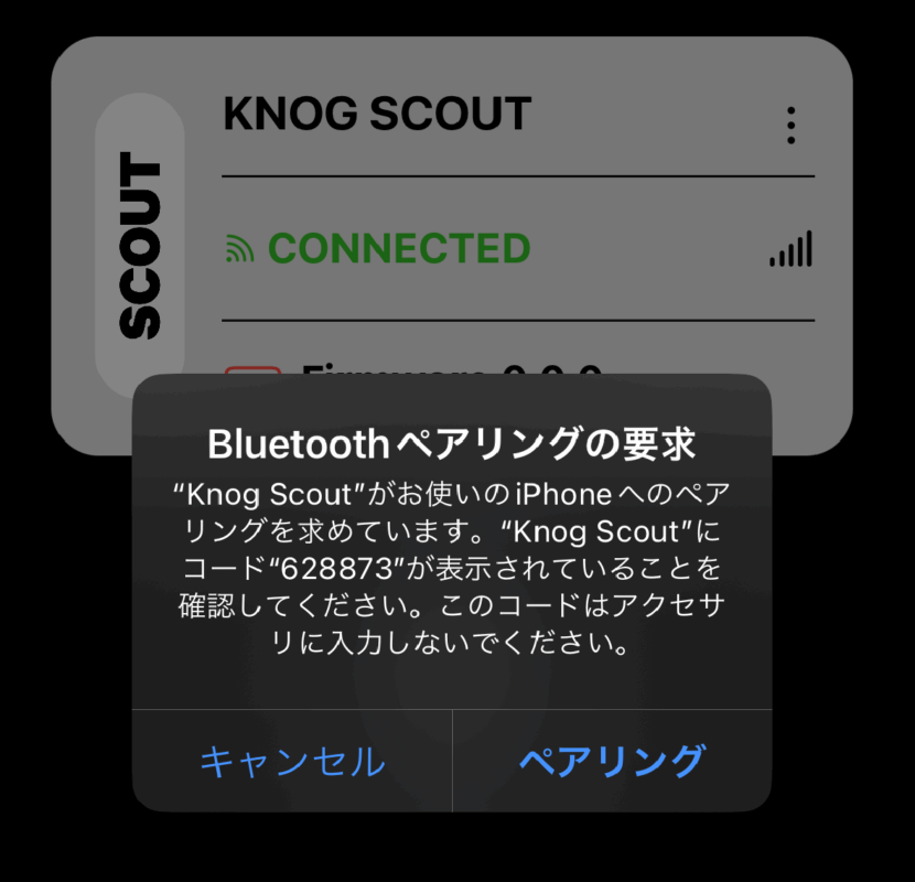 iOSのBluetooth設定から削除し、SCOUTを「工場出荷状態」に戻し再度knogアプリから接続をお試しください。