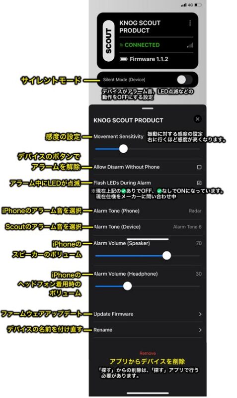 このリストでスカウトを選択すると、「このデバイスの登録を解除」が表示されます。これを行うと、Scout との結合接続が削除され、Knog Mobile アプリからデバイスに接続できなくなります。