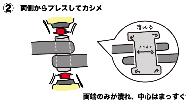 プレートにピンを通し、両側からピンを押しつぶしてカシメを行い固定します。