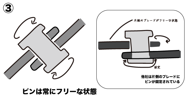 この時、通常のフォールディングロックは、片側のプレートにピンが固定されますが、ABUS BORDOはピンがプレートに固定されないため、常にフリーな状態になります。