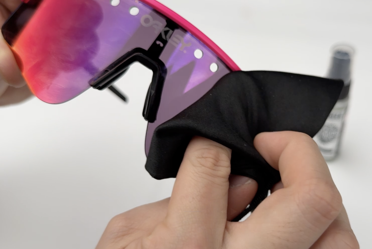 レンズ表面に汚れが付着していないことを確認し、レンズの両面にANTI FOG TREATMENTを吹きかけます。