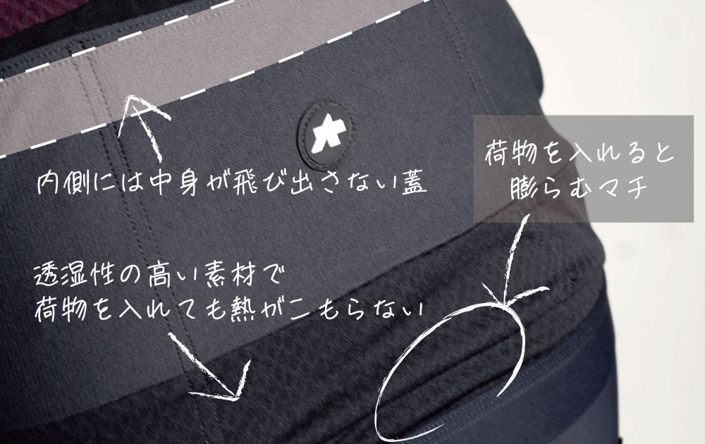 荷物が多く入ることで有名なASSOSのバックポケット。