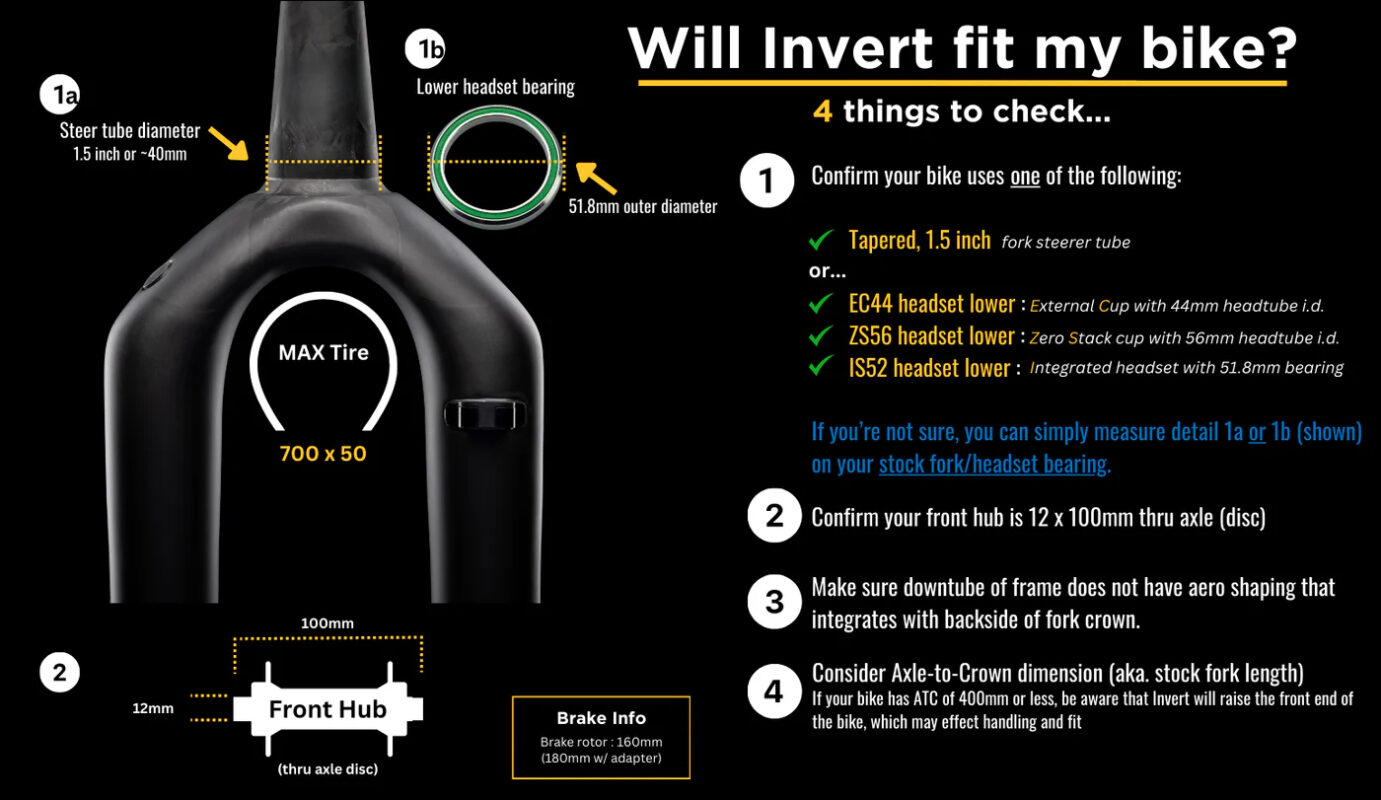 → バイクの純正フォークが400mm以下の場合、Invertを装着するとバイク前方が高くなり、ハンドリングやフィット感に影響する可能性があります