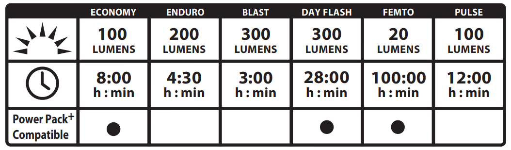 | ■ 最長ランタイム: 100時間(FEMTOモード・20ルーメン) |