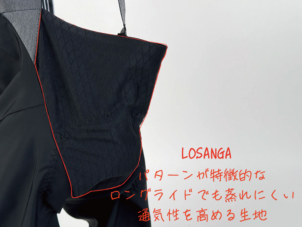 見た目のパターンが特徴的なロサンガは長時間乗り続けるロングライドでも蒸れずらい通気性の高い素材を使用!