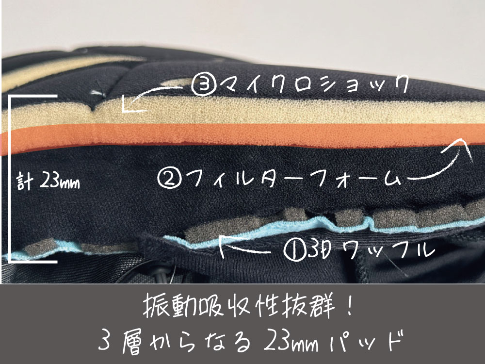 21mmの厚手パッドやロングライド専用生地など使用しロングライドを快適にします。