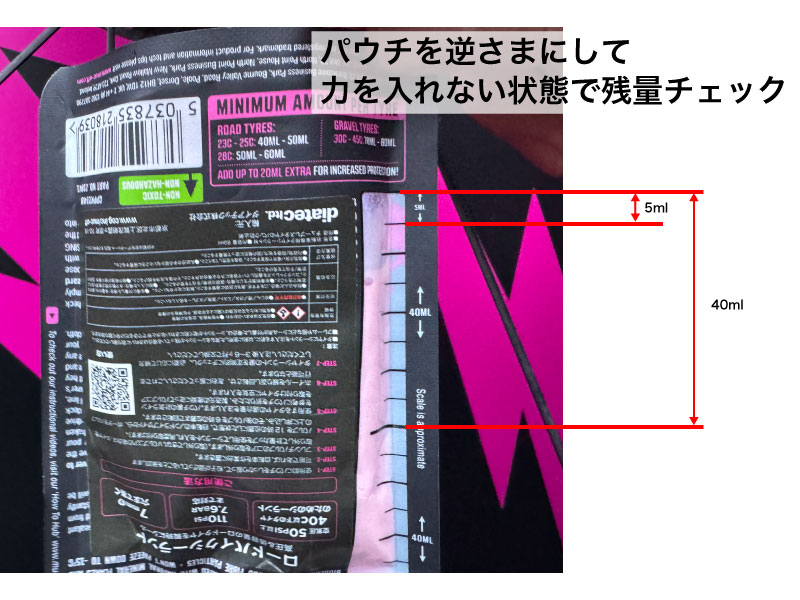 パウチタイプのシーラントの場合、パッケージ裏面の目盛りでシーラントをどれだけ入れたかをチェックすることが出来ます。
