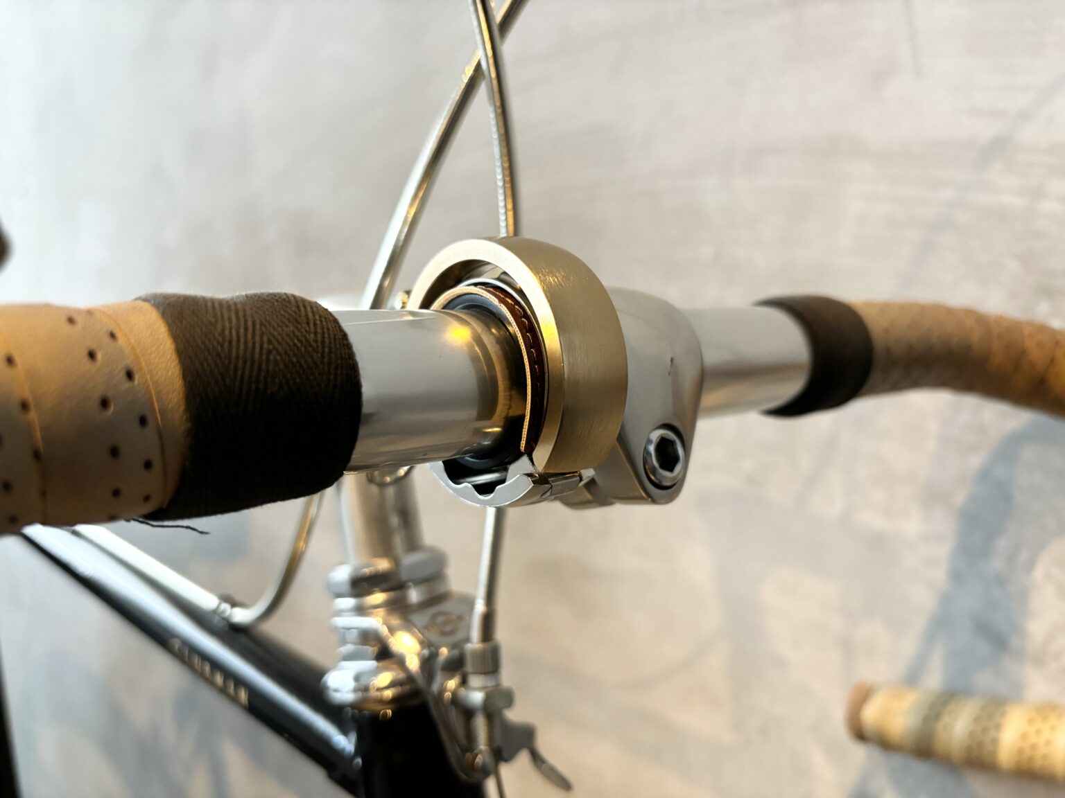 KNOGを代表する商品の”Oi”のアップグレード版 樹脂だったマウント部のパーツが金属になり、レザーのシムになり、 耐久性とラグジュアリーな高級感がアップしました。 ハンマー部分が、樹脂から真鍮に。音の響きがさらに良くなり、 スプリング部分もより頑丈なスプリングにアップグレードされました。 LUXEのベル部分(リンガーというらしい)と、下側部分が分裂し、 ハンドルに互いを被せてネジで止める。ケーブルを逃す溝も健在。 重量はスモールが32g、ラージが42g Oiより金属部の割合が増えて重さは増したが、重厚感も増した。 ベルを鳴らしてもし音が出にくい場合は、 音が響くリンガーの部分に、何かが当たったりしていないか確認。 ケーブルなどの調整やネジの締め具合でしっかり音が鳴るようになります。製品チェック