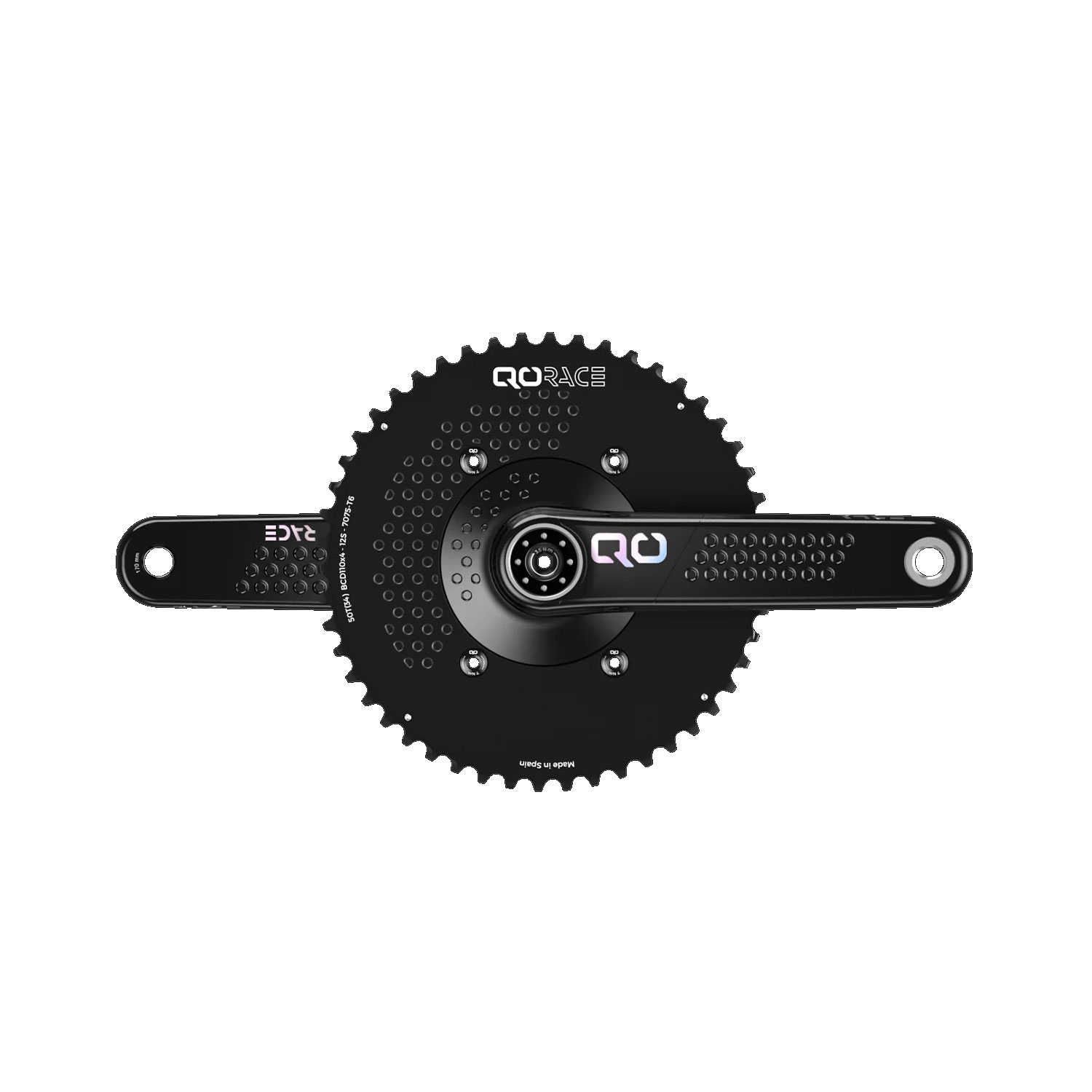 QO RACE クランクセットは、軽量性と剛性、空力性能を高次元で融合させたモデルです。重量はわずか372g。カーボンならではの軽量構造により、踏み出しから数値以上の軽さを体感できます。ヒルクライムでは伸びるような加速感を生み、平坦路では巡航性能を支える存在です。