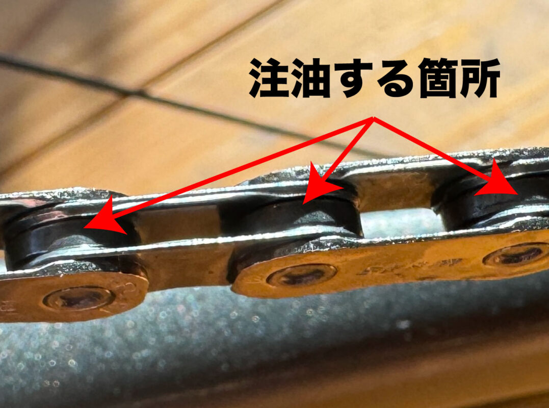 注油する箇所は矢印のチェーンのコマ。クランクを逆回転に回しながら、順番に注油していきます。