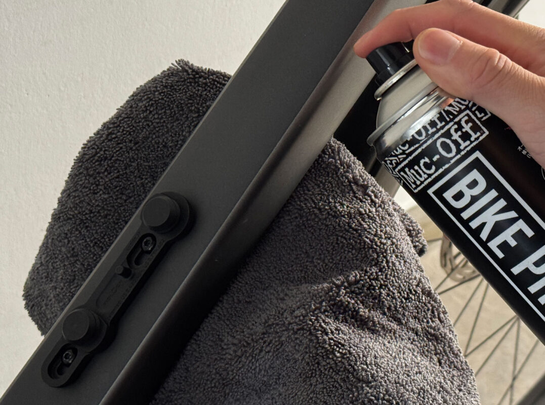 一気に全体にスプレーすると部屋がベタベタになってしまうので、各パーツ(トップチューブ、フォークなど)事に分けて行うのがベスト。